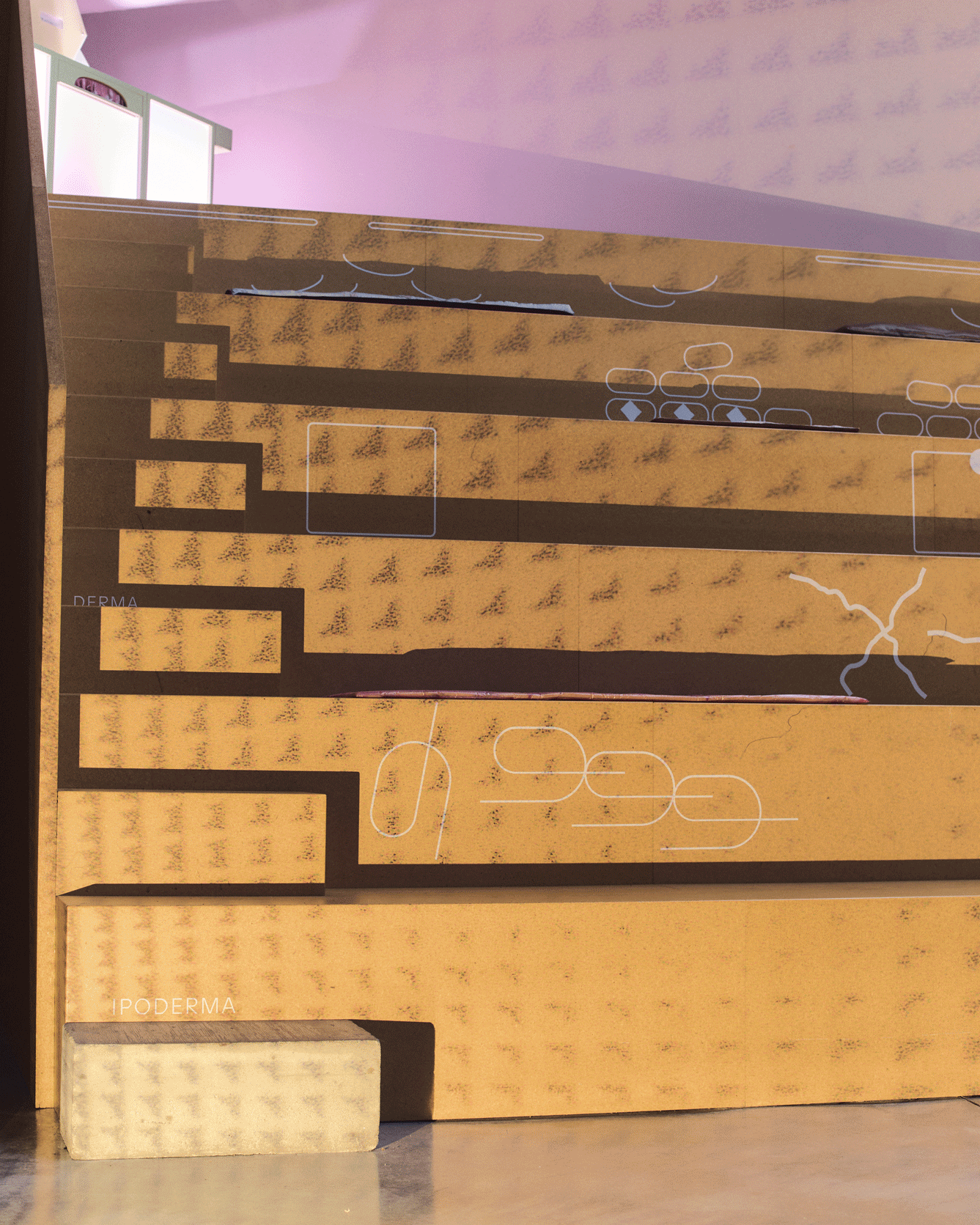 THE STAIRCASE is transformed into a cross-section of epidermis, dermis, and hypodermis. It is populated with epidermal diagrams, luminous projections of scientific and expressive textures, and sensory cushions.